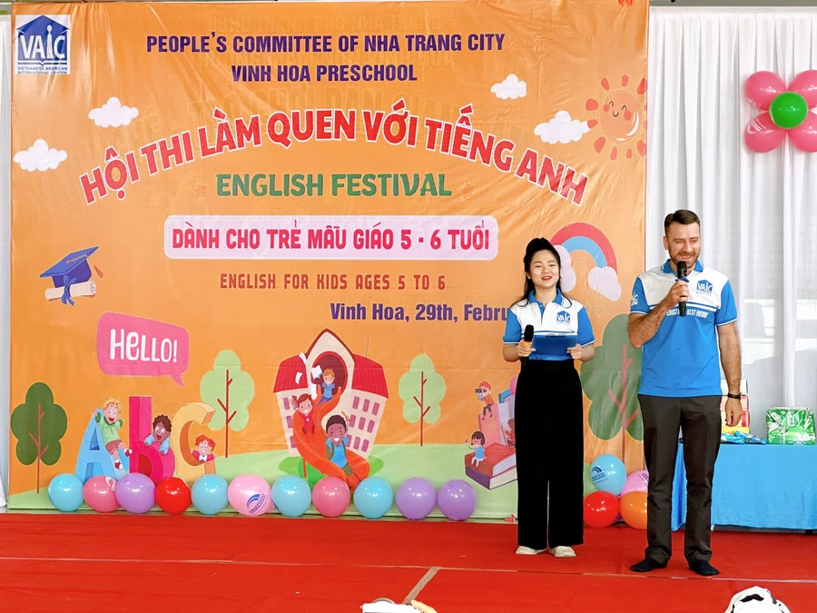 Sáng ngày 29/2/2024, Trung tâm Ngoại ngữ Quốc tế Việt Mỹ VAIC đã phối hợp cùng trường Mầm non Vĩnh Hòa tổ chức “Hội thi làm quen tiếng Anh cho trẻ 5- 6 tuổi cấp trường” nhằm tạo môi trường cho trẻ vui chơi, học tập lành mạnh, bổ ích, giúp trẻ tự tin, phản xạ và tư duy nhanh.